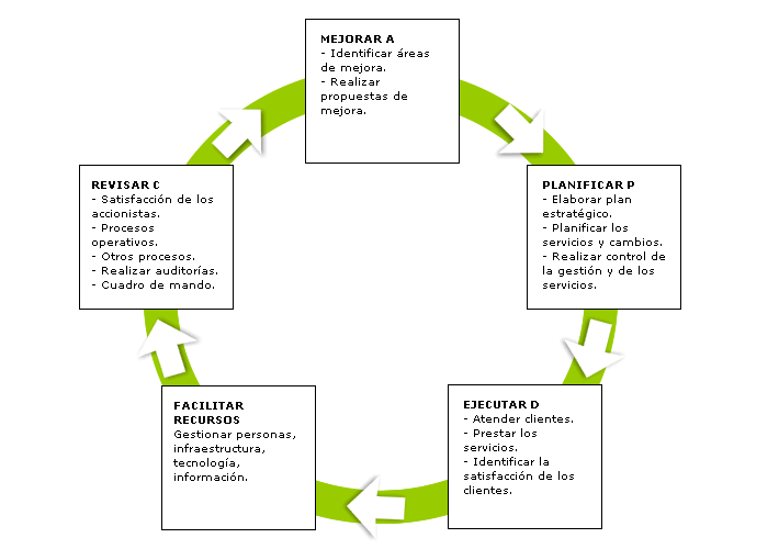Para realizar la mejora de los procesos, a parte de tenerlos identificados, es necesario seguir el método PDCA (Planning, Do, Check, Act) de Deming, que consiste en lo siguiente: